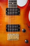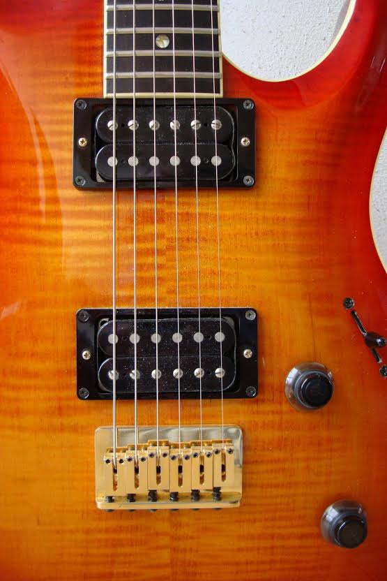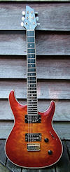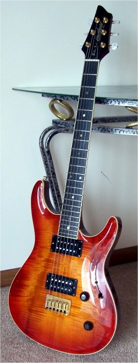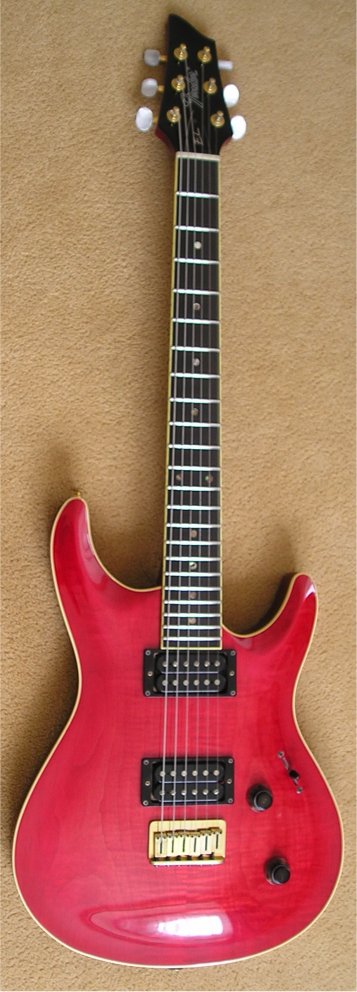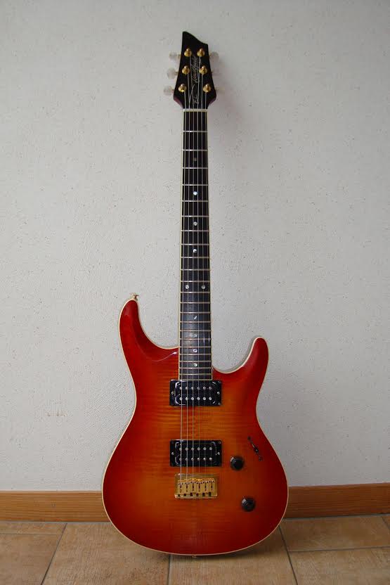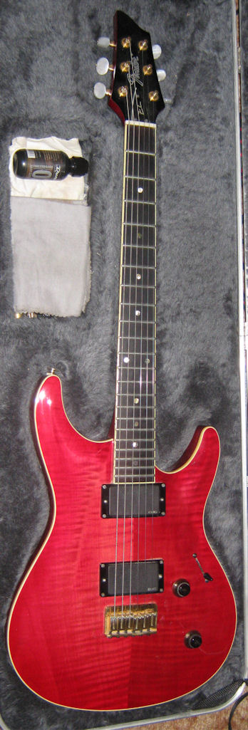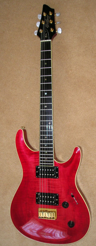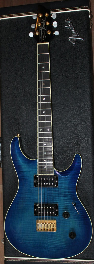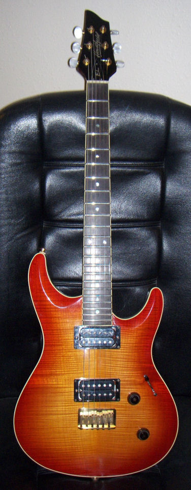 The Elan, a.k.a. Elan I, has a Honduras mahogany neck and body, bound flamed AAA grade maple top, ebony fretboard, Mother of Pearl (sometimes abalone) dot inlays, 22 frets, dual humbuckers (made at the Fujigen plant especially for the Elan, they're not Dimarzios), pearl tuner buttons, gold hardware and a fixed bridge with string through body design. Scale length is 638 mm (25").