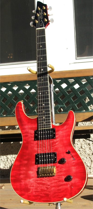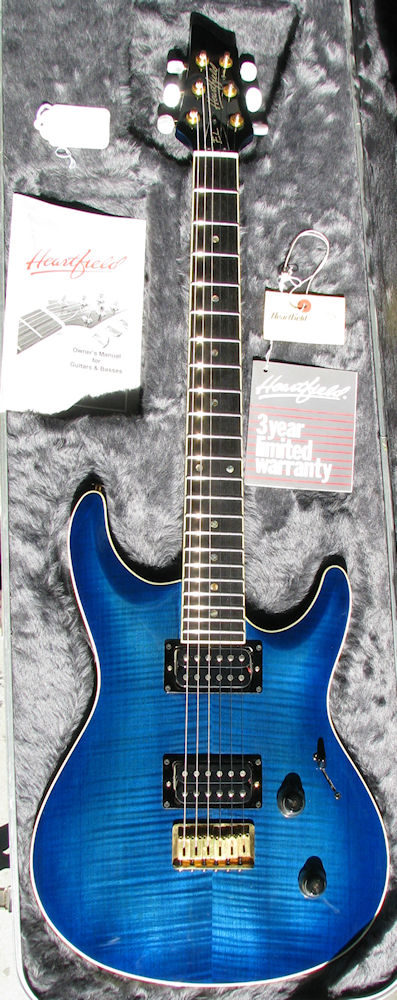 | Remarks: This is Crimson Red Transparent (clear). Note that this guitar, though it is only 2 serial numbers down from another one of the owner's guitars (see below), it is branded differently (Heartfield, not Fender). | ||
