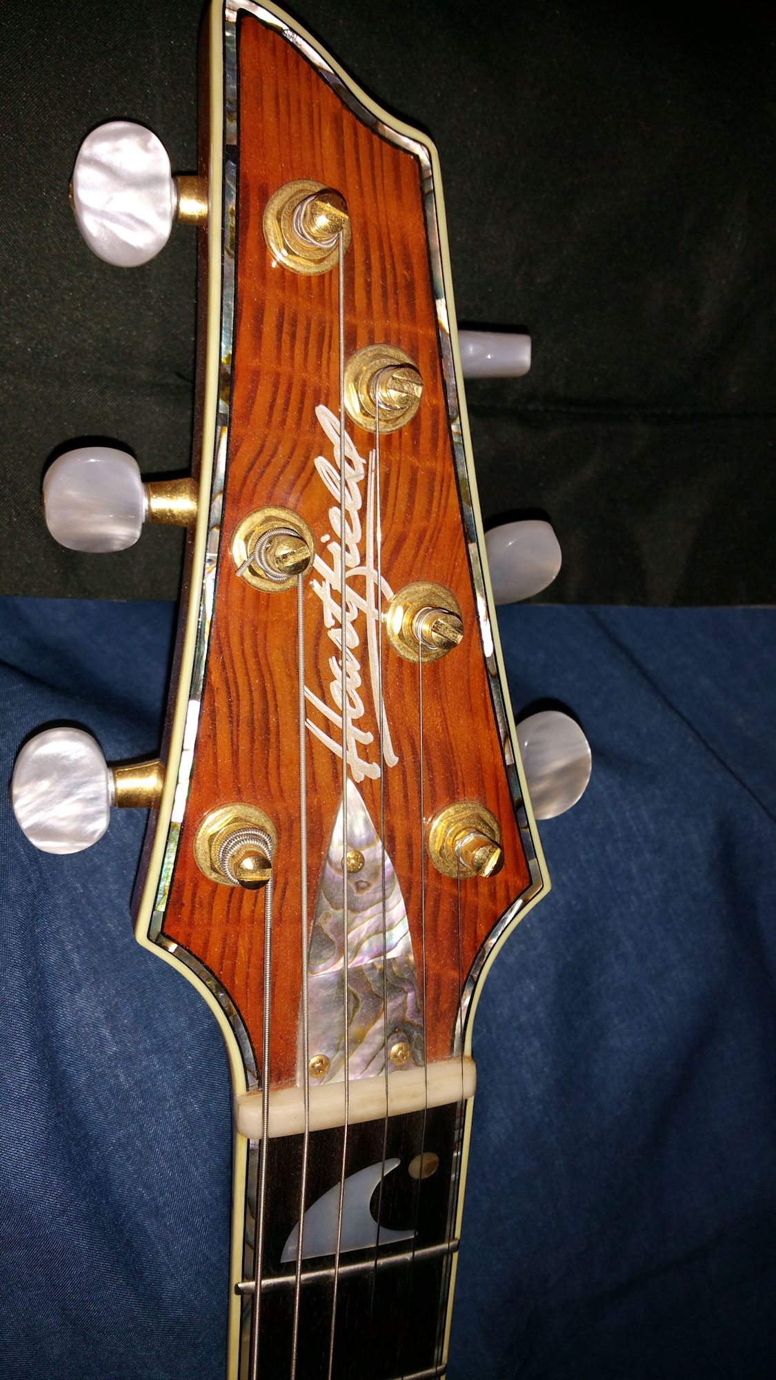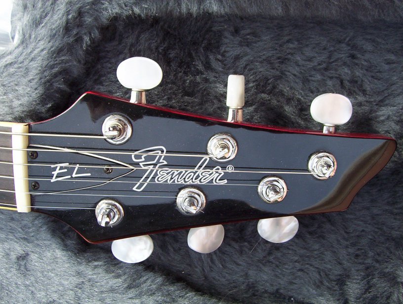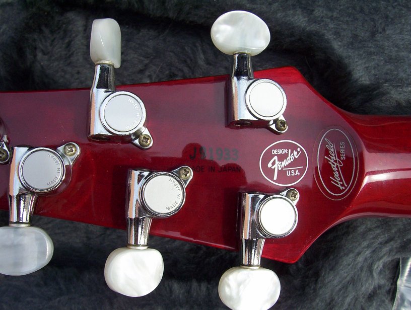 | Remarks: Well...a lot to say about this one! According to Mr Kazuma Natabe, this was possible used by Fender to display during a NAMM show. It was built by Mr Atsumi Suzuki. The top of the body is Redwood, the back is Mahogany and the binding is abalone. The neck is mahogany, with a laminated Redwood headstock and ebony fingerboard (mother of pearl inlays). Medium wide SBB213 frets. Abalone truss rod cover. Scale is 664 mm. Tuners are Gotoh Magnum lock. At the time it was supposed to sell for $2500-3000. The serial number is cut into the fingerboard between the highest fret and the bridge pickup (click here to see) and it is actually HE91003. | ||