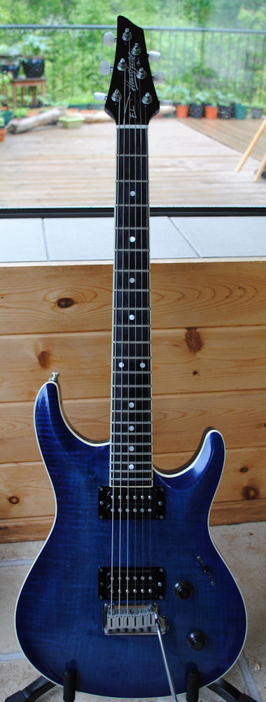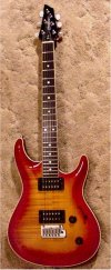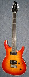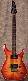 The Elan II has a Honduras mahogany neck and body, flamed maple top, ebony fretboard, Mother of Pearl (or Mexican abalone) dot inlays, 22 frets, dual humbuckers (made by Fujigen especially for the Elan, not Dimarzios) and pearl tuner buttons (locking Gotoh tuners). The difference with the Elan (I) is that it has chrome hardware, a Fender American Deluxe tremolo and a narrower headstock (resulting in straighter string pull). Some models have been seen with an extra single coil pickup in the middle. Scale length is 638 mm.