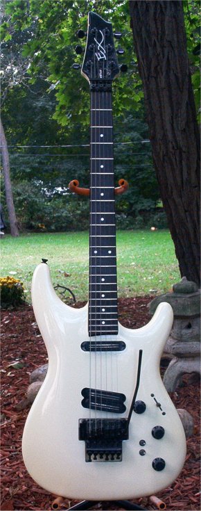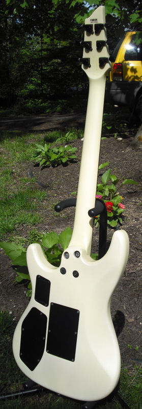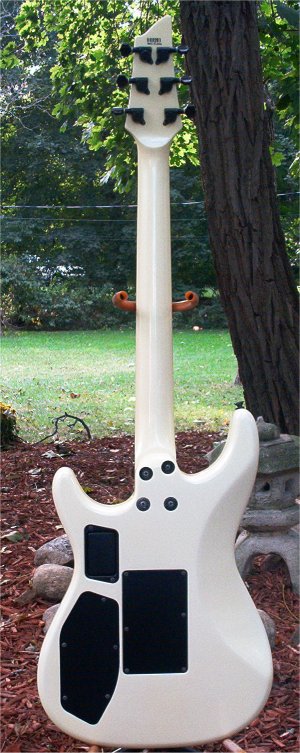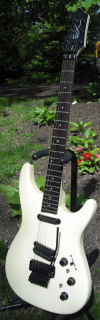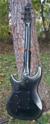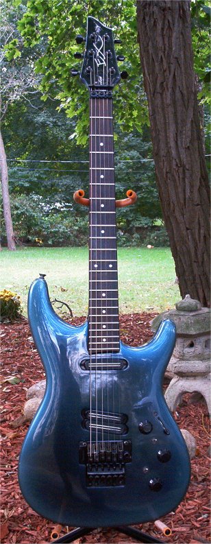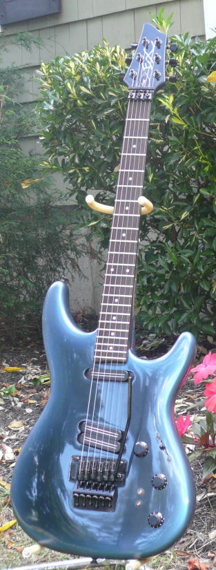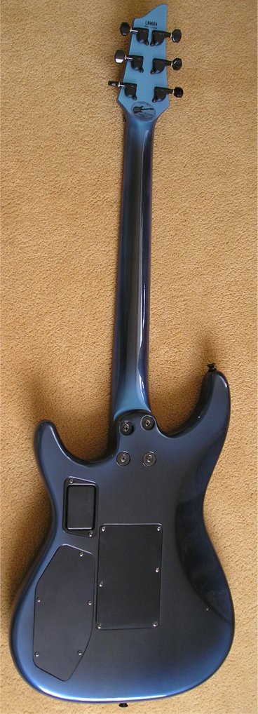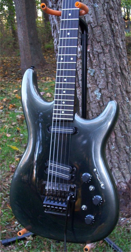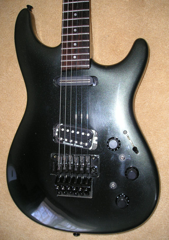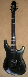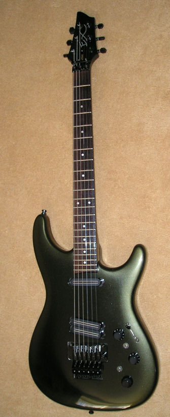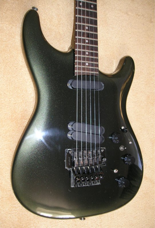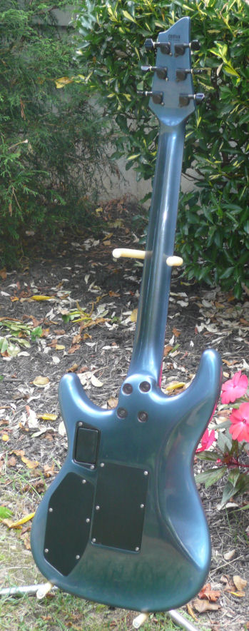 | Remarks: This colour is Black Pearl Burst, bursting from black to green (not quite visible in the picture). It has EMG pickups, pots, switches and an EMG PA-2 pre-amp 20 db boost. | ||