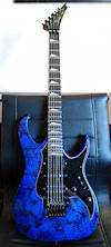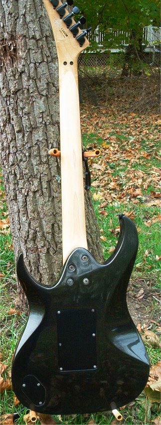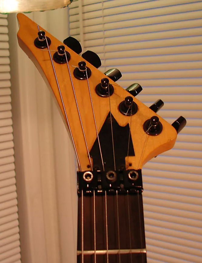 | Remarks: Where to begin? It's in the Talon IV gallery because it has "TA IV" in the neck pocket (see here). But the neck is really out there: The inlays are unusual and even the angle/shape of the headstock seems different from usual. And, obviously, it has a reverse headstock which the IV normally didn't. The electronics are all stock Talon, but it has Dimarzio X2N's at bridge and neck. The middle pickup is simply labeled "2BP", manufacturer unknown. Tuners are Grover & appear original. It originally had a Floyd Rose Pro on it and was routed for such, but that trem was damaged, so the owner put a Floyd-licensed Kahler (USA) on it so it could be played. Not possible to tell if this is a prototype or, instead, a regular Talon IV body that had its pickups, control knobs and neck swapped out. But definitely an unusual axe! | ||